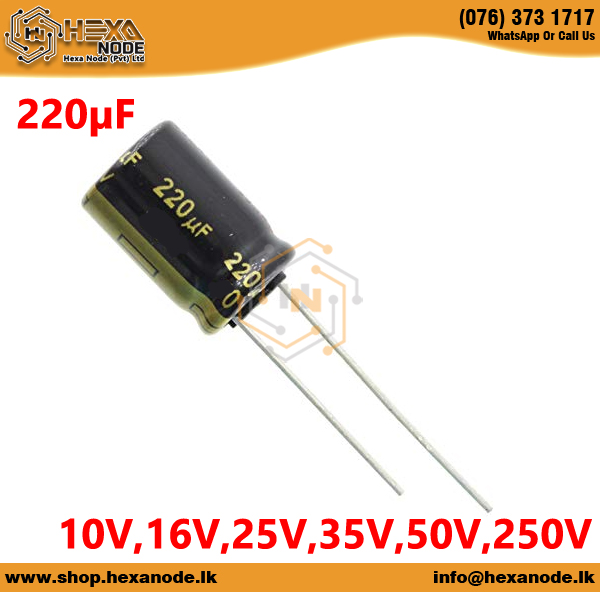 The 220µF / 220uF Electrolytic Capacitor series is designed for a wide range of voltage requirements including 10V, 16V, 25V, 35V, 50V, and 250V, making it suitable for both low-voltage and high-voltage electronic applications. These high-quality aluminum electrolytic capacitors offer excellent filtering, smoothing, and energy-storage performance across various power circuits.