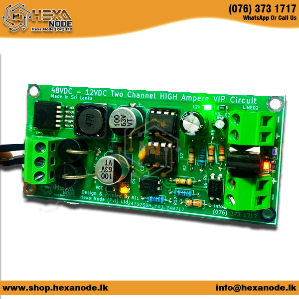 The 48VDC – 12VDC Two Channel High Ampere VIP Circuit is a highly efficient voltage step-down (buck) converter designed to provide stable and reliable power conversion from 48V DC to 12V DC for high-amperage applications. This versatile circuit features dual output channels, capable of handling high currents while maintaining optimal efficiency, making it ideal for powering motor drives, power supplies, industrial equipment, telecommunications, and automotive electronics. The VIP circuit is engineered for low heat generation and high performance, with features like overcurrent protection, thermal shutdown, and short-circuit protection to ensure safe and continuous operation under heavy loads. Whether used for DC-DC converters, solar applications, or battery-powered systems, the 48VDC – 12VDC Two Channel VIP Circuit ensures reliable performance in demanding conditions.