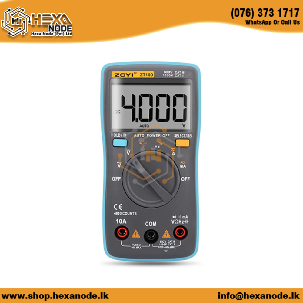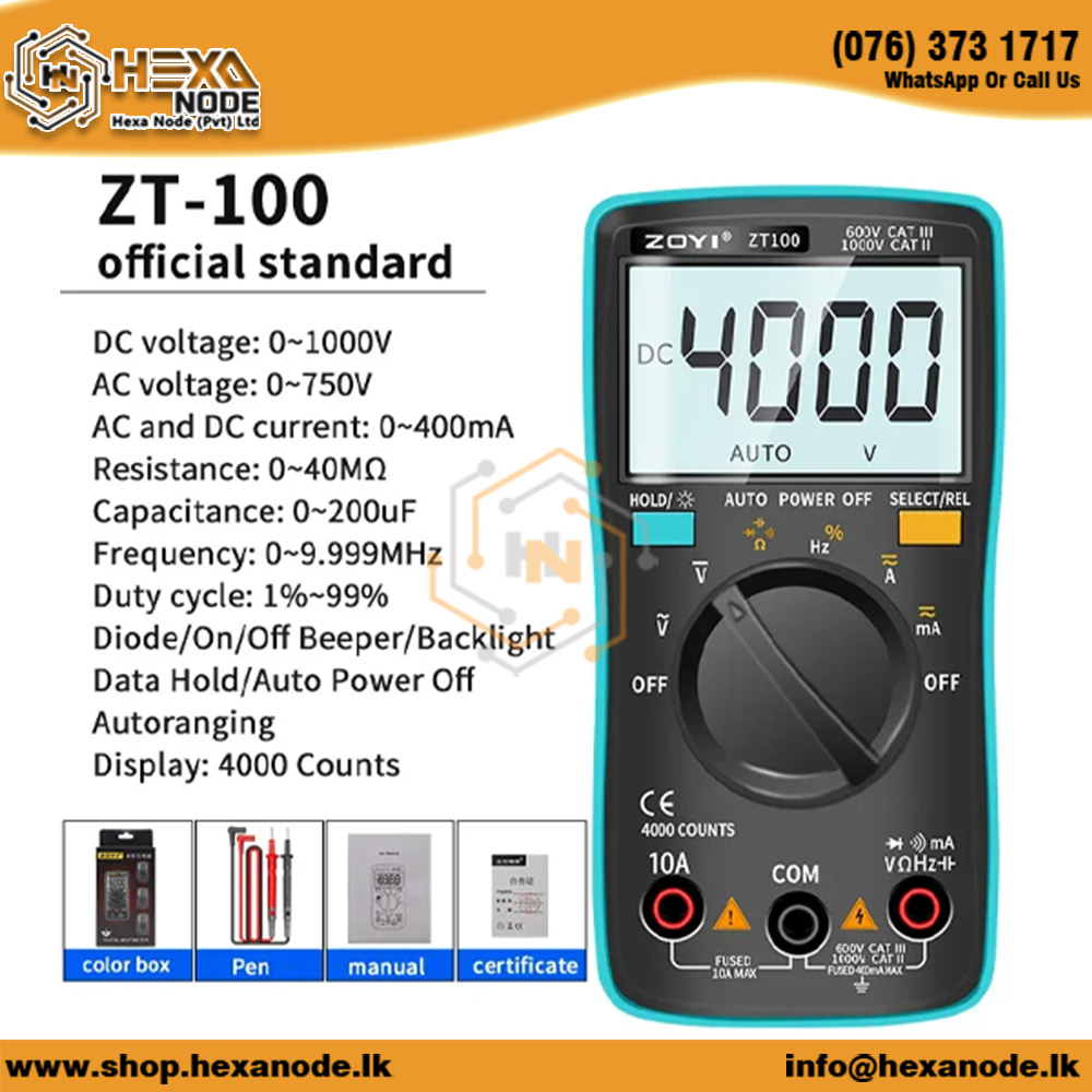 The ANENG ZT100 Digital Multimeter is likely a versatile and portable measurement tool designed for electricians, students, and DIY enthusiasts. It typically features a 4000-count display and supports various measurement functions, including AC/DC voltage, AC/DC current, resistance, capacitance, frequency, duty cycle, and diode testing. The multimeter is often powered by 2 x AAA batteries and includes features like auto-ranging, data hold, backlight, and low battery alert.
