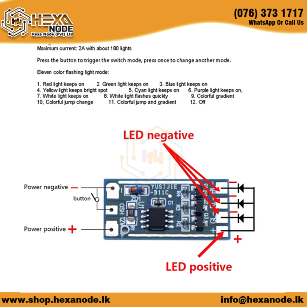 - 11 Pre-programmed Modes: The module offers 11 different modes, including solid colors, flashing effects, fading transitions, and color-changing patterns to suit a wide range of lighting preferences.