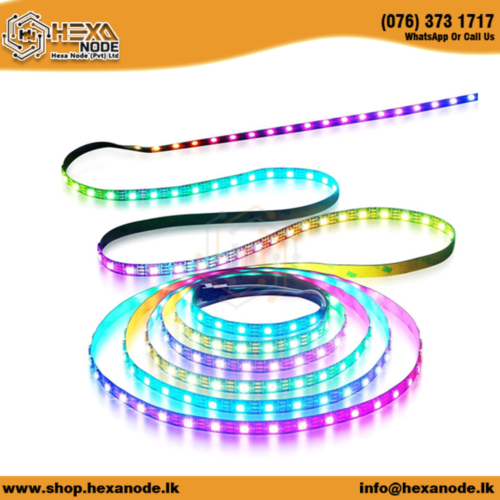 • Addressable RGB LEDs: The strip features 60 WS2812 addressable pixels per meter, each with full RGB color control, allowing for highly customizable lighting effects on a per-pixel basis.