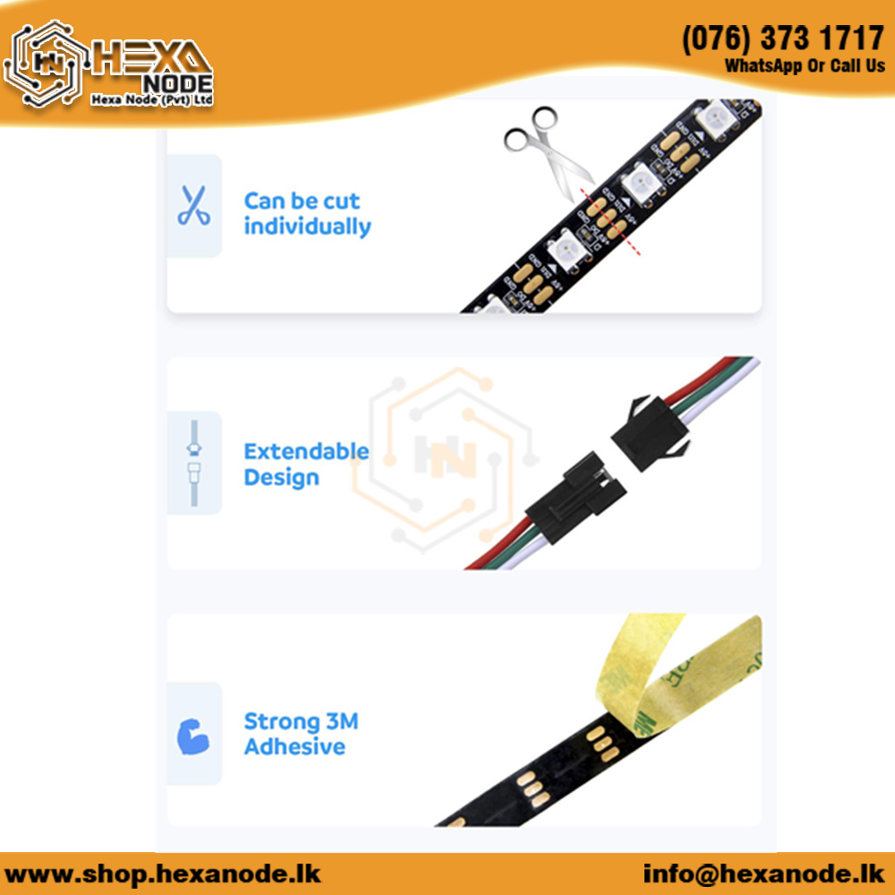 • Flexible and Cuttable: The strip is flexible, allowing it to be bent into various shapes, and can be cut between the pixels to fit your project’s specific requirements.